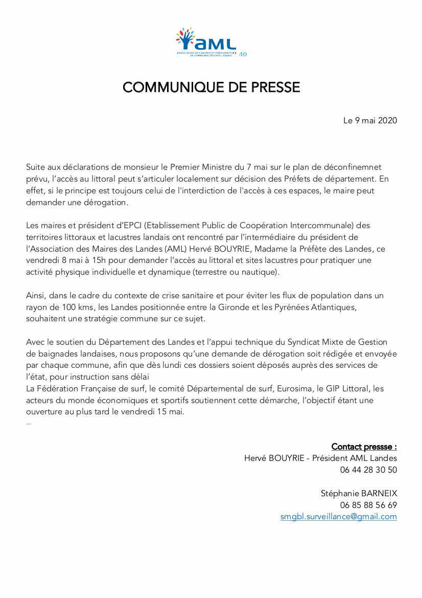 Communiqué de presse de l’Association des maires et présidents de communautés des Landes (AML 40) concernant leur demande à Mme la préfète d’autoriser l’accès au littoral et sites lacustres pour pratiquer une activité physique individuelle et dynamique (terrestre ou nautique).