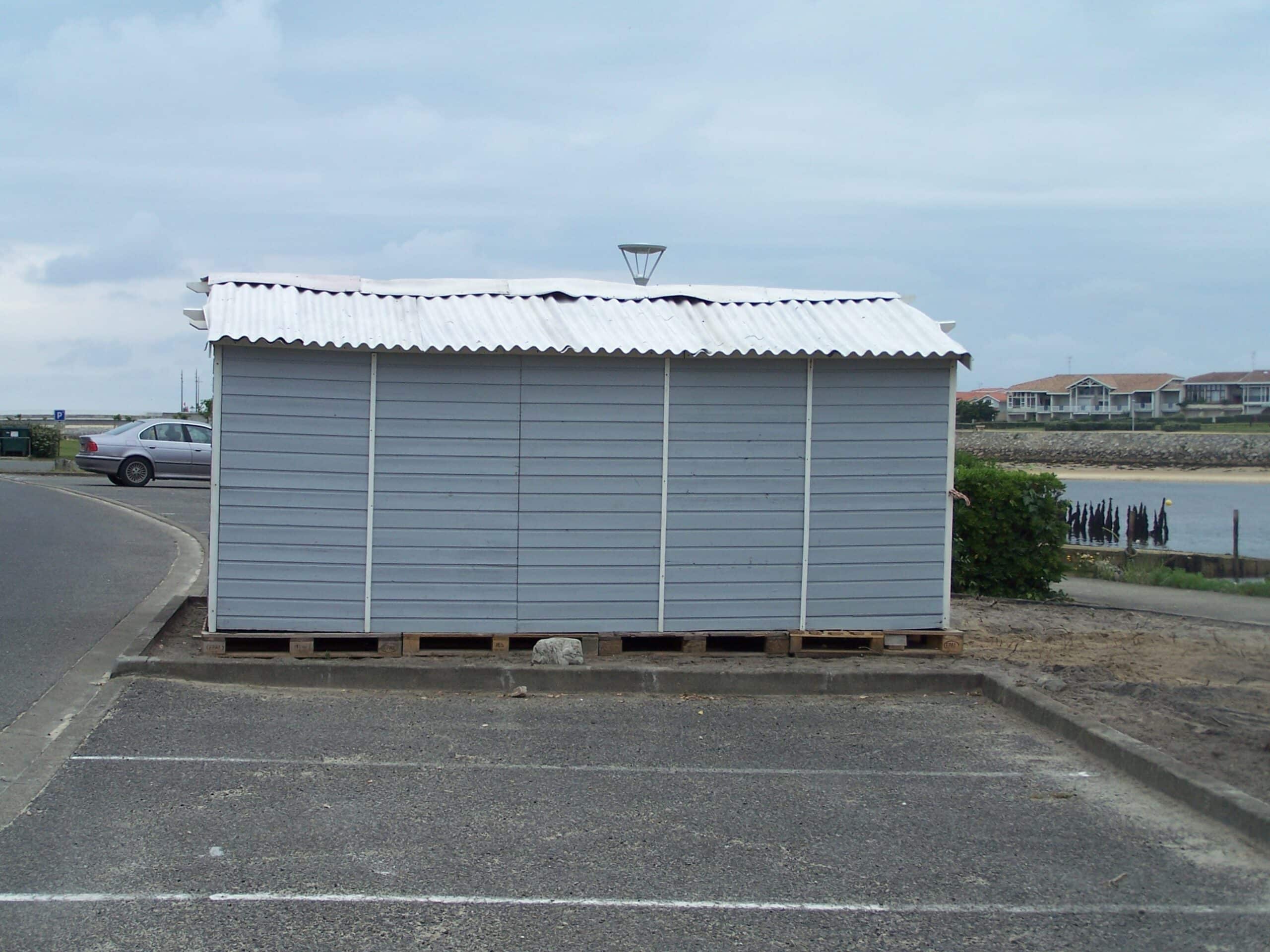 Voici des clichés de la nouvelle cabane-verrue, posée sur des palettes, sur le parking voitures au bord du Courant, près de la descente à bateaux.